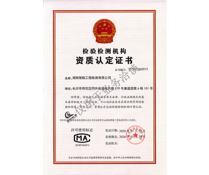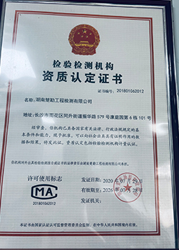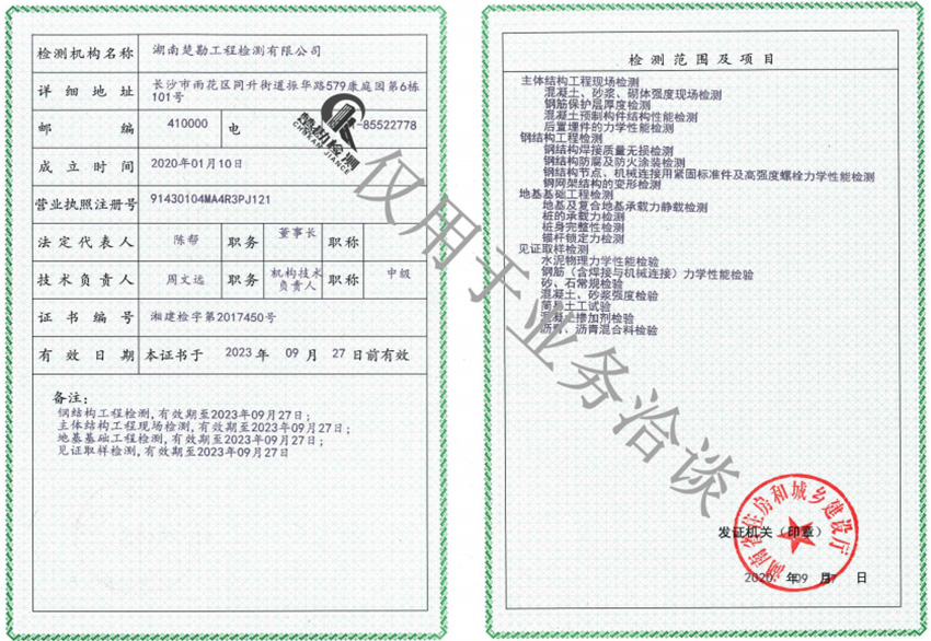 建设工程质量检测机构资质证书 公司于2020年9月27日取得建设工程质量检测机构资质证书(证书编号:湘建检字第2017450号),公司能力认定的领域包括钢结构工程检测、主体结构工程现场检测、地基基础工程检测、见证取样检测等专业方面的检验检测能力。